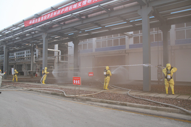 只見噴淋洗消裝置在值長的指示下及時開啟??傊笓]接到報告后立即指示啟動氯氣泄漏應(yīng)急預(yù)案,并通知公司防護(hù)專業(yè)分隊至泄漏區(qū)進(jìn)行搶險救援。隨著現(xiàn)場氯氣的擴(kuò)散,氯堿事業(yè)部的SIS系統(tǒng)自動啟動,液氯泄漏區(qū)的廠房全部自動關(guān)閉,氯氣吸收系統(tǒng)自動啟動,將泄漏的氯氣封閉在廠房內(nèi),防止氯氣向外擴(kuò)散。公司對重大危險源管控的工程措施在此刻發(fā)揮了重要作用,為應(yīng)急堵漏贏得了時間。演練中,參演人員各司其職,現(xiàn)場加強(qiáng)警戒進(jìn)行標(biāo)示,及時疏散人員,快速處置氯氣泄漏,緊急搶救中毒人員,時刻監(jiān)測周邊環(huán)境……