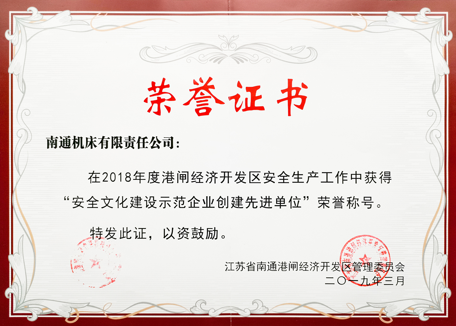 近日,南通市港閘區(qū)政府表彰了2018年度港閘經(jīng)濟開發(fā)區(qū)安全生產(chǎn)先進集體和先進個人。南通機床獲 “安全文化建設示范企業(yè)創(chuàng)建先進單位”榮譽稱號。