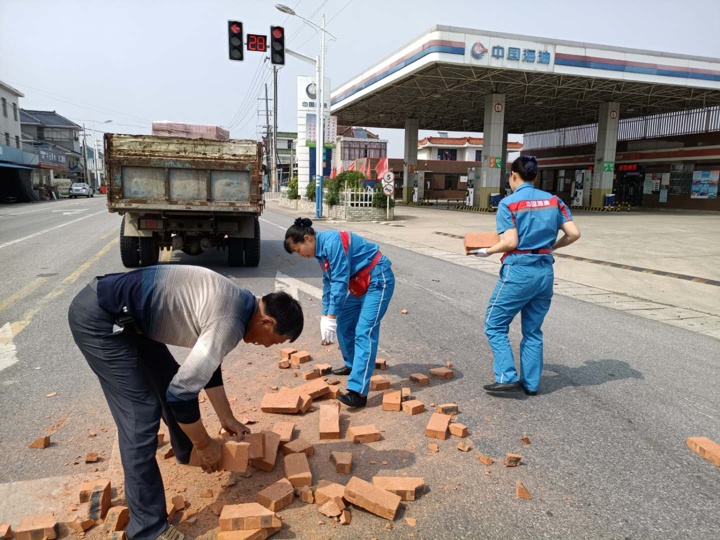 夏天的中午,天氣炎熱,似乎連樹上的知了也停止了歌唱。華東銷售南通公司栟茶加油站站前道路,似乎和往常一樣,車輛人流來來往往,當(dāng)班的繆小紅和蔡翠和頂著炎熱在加油島上等待下一個(gè)顧客來加油。突然,“吱呀~~~”一個(gè)急剎,一輛避讓行人的運(yùn)磚車差點(diǎn)翻車,晃悠了幾次總算停穩(wěn)了,但是車上的磚塊紛紛滾落。后方行駛的車輛有些來不及避讓,差點(diǎn)釀成新的事故,散落的磚塊對道路交通安全構(gòu)成隱患。司機(jī)驚魂未定,趕忙下車查看,立刻開始將散落在道路上的磚往車上搬。