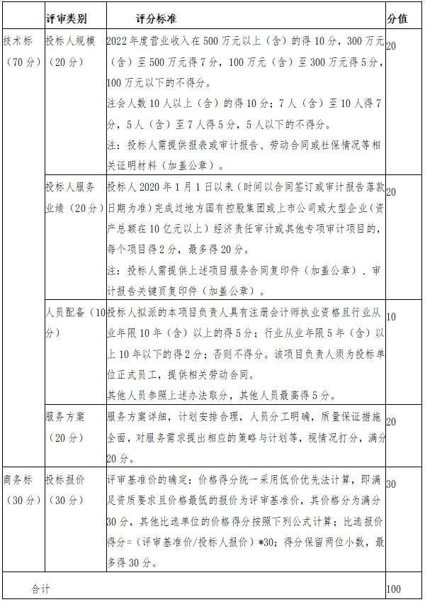 本項(xiàng)目采用綜合評(píng)標(biāo)法,由產(chǎn)控集團(tuán)評(píng)標(biāo)小組對(duì)各投標(biāo)人技術(shù)標(biāo)和商務(wù)標(biāo)進(jìn)行綜合評(píng)審和評(píng)分。評(píng)分采用百分制,按總得分(技術(shù)標(biāo)得分與商務(wù)標(biāo)得分之和)從高到低的順序確定排名次序,總得分排名第一的投標(biāo)人為中標(biāo)人;如遇兩家投標(biāo)人總得分排名并列第一時(shí),則商務(wù)標(biāo)得分高的投標(biāo)人為中標(biāo)人;如商務(wù)標(biāo)得分一致,則通過抽簽方式確定中標(biāo)人。技術(shù)標(biāo)最終得分為所有評(píng)委評(píng)分的算術(shù)平均值,評(píng)分值均保留至小數(shù)點(diǎn)后兩位。 具體評(píng)分標(biāo)準(zhǔn)如下: